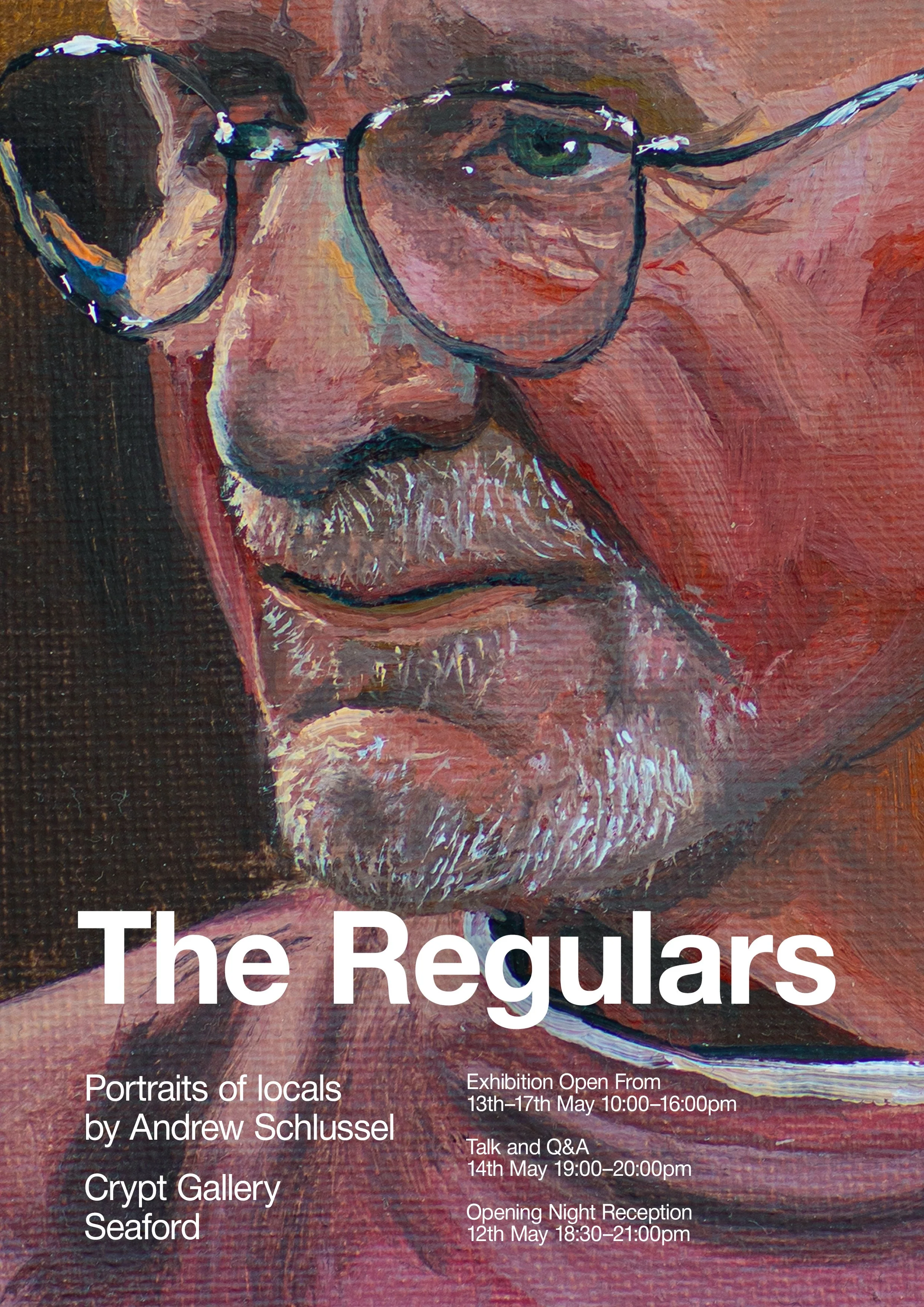 "The Regulars" is an exhibition of the portraits by Andrew Schlussel. The regulars are people who habitually go to the same venues in Seaford, such as the pub, cafe, sauna or beach. They are regulars in that they go regularly but also they are regular people, meaning they are not celebrities. This art is mean to celebrate regulars in both senses of the word, those who surround us and create our community. Our life stories are written on our faces and Andrew hopes to show that through his artwork.